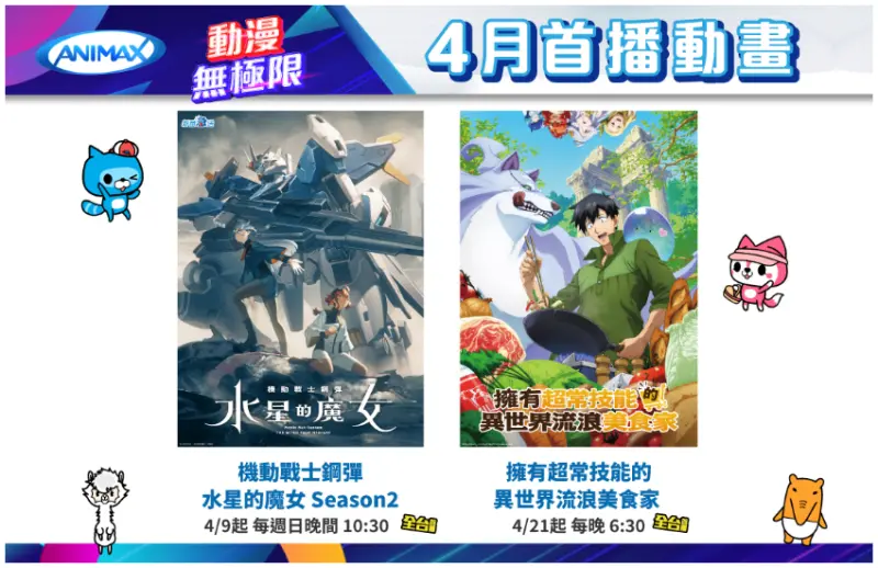 Animax 頻道為歡慶 4 月 15 日的國際動漫日,今年首度舉辦為期一個月的「動漫無極限」活動,結合全新感官體驗,和粉絲一起爆發動漫小宇宙!眾多超人氣動畫強勢登場 ,與日本同日播出的《機動戰士鋼彈-水星的魔女 Season2》刺激戰鬥場景震撼你的視覺、異世界美食番《擁有超常技能的異世界流浪美食家》搭配 MAPPA 超高水準的美食作畫,讓你隔著螢幕都能聞到香氣、首次國語配音《被勇者隊伍開除的馭獸使、邂逅了最強種的貓耳少女》帶給你不一樣的聽覺饗宴。Animax 頻道寵粉無極限,更將舉辦「看鋼彈送鋼彈」看電視抽大獎活動,豪華贈送全球限量的「鋼彈模型」和美味日本零食驚喜箱,Animax 頻道為觀眾打造絕無僅有的全新動漫感官體驗,Animax 頻道就是要你看得到、聽得到、吃得到、玩得到,顛覆你對動漫的想像,翻轉你的動漫感官體驗!Ani![]()