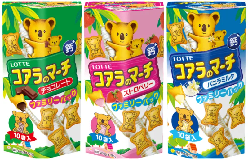 大人小孩都喜歡的樂天小熊餅,1984於日本誕生,當時澳洲計畫送日本兩隻無尾熊,開發人員們立刻受到了啟發,於是決定要設計出以無尾熊為範本的卡通人物,並且立定了要將這個無尾熊卡通人物印在餅乾上的企劃,同時結合空心餅乾技術、推出小熊餅乾,並取名「コアラのマーチ」,「像可愛的遊行吹奏樂團(Marching Band)一樣,今後也會有很多無尾熊陸續地來到日本」這樣快樂的景象為靈感,因此決定使用「Koala no March(無尾熊大遊行)」這個名字。而樂天小熊餅獨特的六角柱型紙盒包裝,其實也是以無尾熊最喜歡的尤加利樹為靈感所設計出的造型。![]()