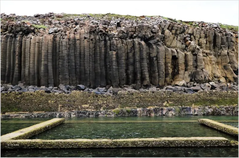 站在漁塭正中央看著眼前的池西岩瀑還真是壯觀,這裡的岩瀑屬【彎曲狀節理】與其它地方看到的【柱狀節理】都不同怎麼看都挺雄偉,看久了還真的挺像瀑布直瀉而下的視覺效果<全文介紹>
