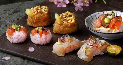 MJ Kitchen廚藝團隊表示,這一次全新吃到飽菜單,希望將海洋氣息端上餐桌,以中西日式的多樣化烹調方式。其中在冷菜區「鮭魚紅酒洋梨沙拉」,將鮮嫩的鮭魚塊、翠綠生菜與以紅酒煨煮的西洋梨盛盤,再淋上紅酒醬汁,清爽中又帶有紅酒的醇厚。