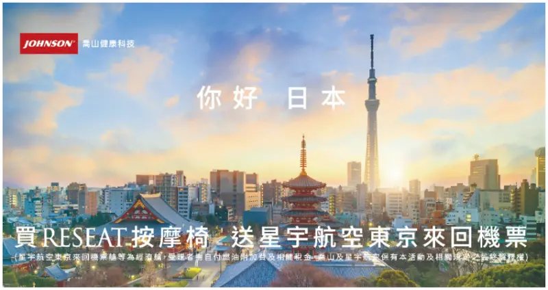 在溫馨感恩的五月天,媽媽健康是心中永遠的期盼、也是最好的禮物,即日起至5/31日止,喬山歡慶母親節,買RESEAT按摩椅,原價 : 288,000元,特價:278,000元,再送星宇航空東京來回機票(經濟艙半年票,需自付燃油附加費及相關稅金) 。詳情請洽Johnson喬山健康科技參觀選購,商品諮詢專線:0800-017-360,產品網址 : http://www.johnsonfitness.com.tw。