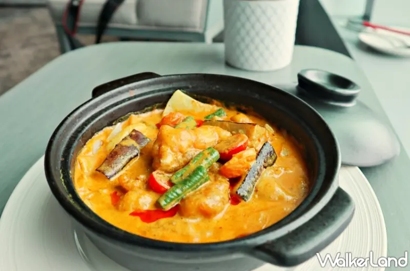 而第二吃「咖哩龍膽頭腩」龍膽頭腩是指魚頭和魚肚的部位,主廚說前者富含膠質,後者則是油香滑潤,他特別採用懷舊的港式咖哩味型,讓滑溜的龍膽頭腩不顯膩卻特別好吃。