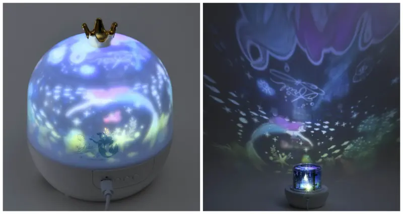 撈錢程度一流的日本迪士尼專賣店,為了搭配5月底將上映的《小美人魚》真人版電影,便以主角愛麗兒生活的大海為主題,以淡藍色與紫色等沉穩的色調,設計出一系列室內裝飾品和生活雜貨,其中鐵粉必買的就是既浮誇又可愛的「小比目魚貝殼LED燈」,可以看到在貝殼造型的底座裡,有小比目魚、海馬、海星與珊瑚等海洋生物,當你打開開關時,中間的巨大珍珠將會散發出藍色光芒,瞬間夢幻度爆表。