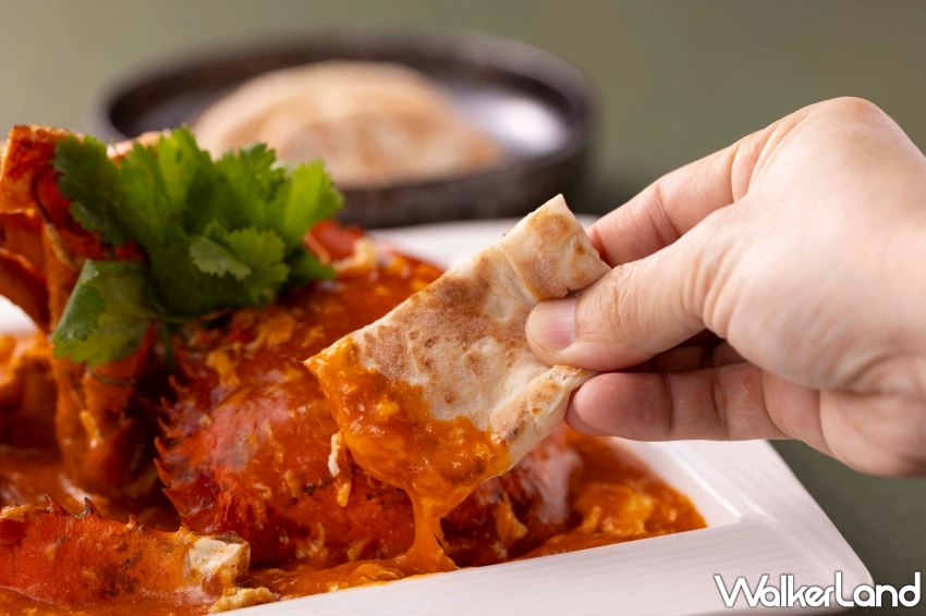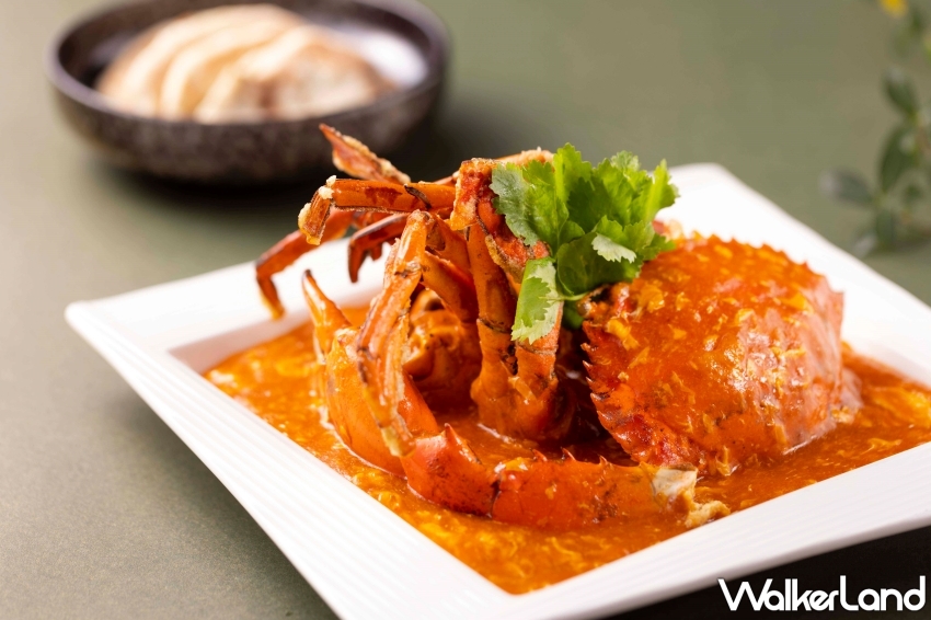 此外,還有最人驚訝的就是「招牌紅油咖哩青蟹搭水潤餅」,將紅咖哩醬充分炒出香氣後加入肉質飽滿、重達18兩的大沙公同煮,醬汁吸足螃蟹鮮味,且因不加參峇醬,滋味柔和更加順口。主廚特別準備新竹老家素有平安餅之稱的水潤餅供來賓沾食醬汁,淡淡肉桂餅香與紅咖哩意外合拍,水潤餅全台目前僅剩一家老舖在生產、特值一試。