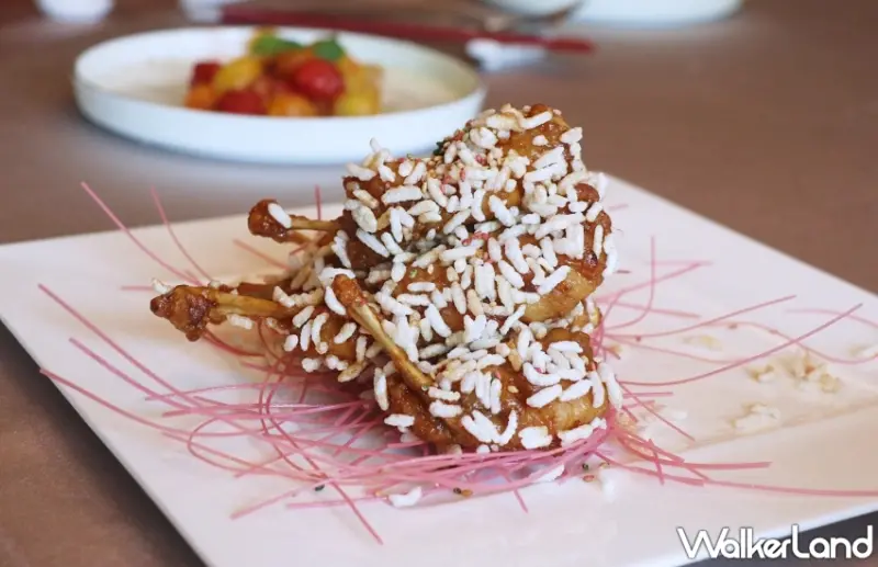 一般脆米多用泰國香米製作,吳主廚的脆米則選花蓮產的醜美人(高雄139號)蒸熟、風乾、油炸而成,搭配酸甜細嫩的田雞腿除了脆感還帶淡淡米香,十分搭調。