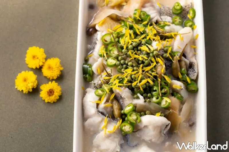 當然不能錯過人氣話題名菜「泡野山椒浸斑片」泡野山椒是以朝天椒醃製發酵而成,滋味酸中帶辣,是新派川菜常用的調味品,這道泡野山椒浸斑片做法來自人氣川菜館老闆娘的分享,吳主廚說:「煮魚的雞湯要用黃皮雞蒸六小時,取下雞肉煎香再入湯中煮半小時濃縮滋味,最後加入豬油使湯汁乳化成奶白色。」豐美的雞白湯滋潤了活殺的龍虎斑片,讓鮮美魚肉更顯嫩滑,泡椒的辣、客家酸菜的酸和青花椒的麻,在舌尖交織成令人一試難忘的風味。