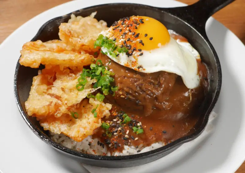 可可摩可(ココモコ)將韓式泡菜天婦羅作為拼盤上的配料,加入在夏威夷當地的特色料理「洛可摩可」(locomoco)中。米飯使用了蒜味飯。![]()