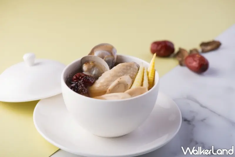 此外,「牛蒡蛤蠣清雞湯」,看似尋常卻極為講究火侯掌控得宜的湯品,須先把乾燥牛蒡茶小火慢煮湯汁約莫3小時,再以熬煮的牛蒡湯汁燉煮雞翅肉及新鮮牛蒡片,添加蛤蠣使其湯頭鮮甜甘美,雞翅肉在長時間的燉煮下入口軟嫩滑順,另放入箭筍與紅棗既能增加口感又兼養生補氣,特別適合在春季享用色澤濃郁啜飲清甜的元氣精力湯品。