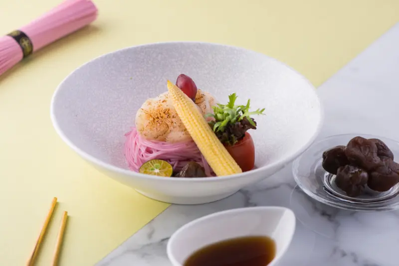 而在聚味軒中餐廳方面,主廚李俊毅訴求新鮮時令、自然原味、健康養生為組合,簡約烹調的料理技法,讓當季的美味呈現餐桌,淺嚐春日輕盈的曼妙滋味。其中,「炙燒干貝梅子麵」選用來自日本手工的森川梅麵煮熟後冰鎮,嫣紅透亮的麵條裹覆著梅肉的酸甜滋味,搭配透過直火炙燒的生食級新鮮干貝切片,與爽口青翠的時蔬,主要的特色精華在於使用昆布及魚乾熬煮為基底的醬汁,味道細緻優雅,完整平衡地帶出食材原味的鮮甜。麵條軟Q干貝彈牙,是春日裡鮮甘開胃的料理選擇之一。