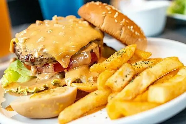 看看牛肉漢堡排上面的起司以及有如火山爆發一般的花生醬~看了都讓我食指大動~尤其覆蓋整個漢堡帶有顆粒的花生醬,太迷人啦~<全文介紹>