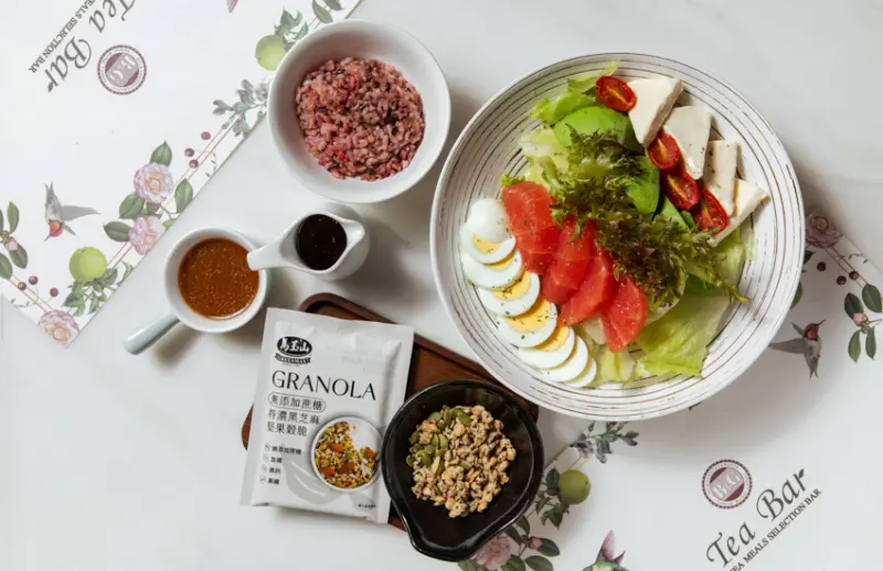 同場加映:另一款獨家合作的「芝麻起司能量餐」,則是將馬玉山的健康理念與B&G德國農莊複合式茶館餐點的養生概念完美結合,紫米飯搭配生菜、酪梨、葡萄柚、起司,均衡營養滿滿的能量,適合配上一杯B&G德國精心製作的茶飲,讓人們在繁忙生活中擁有一個放鬆片刻。