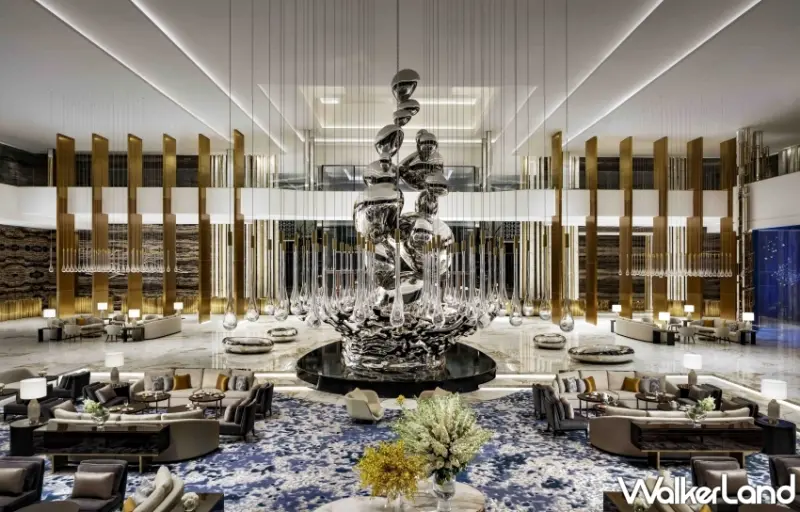 一進大廳,迎面而來的巨型雕塑《水滴》,高 11.5 公尺的原創藝術品,由 5.5 噸不銹鋼組成,代表乾燥沙漠中第一滴涼爽的雨水。大廳四周更有超過 4,000隻水母迎賓,極可能會被這個號稱世界最大的水母魚缸所型塑的夢幻Lobby給震撼。