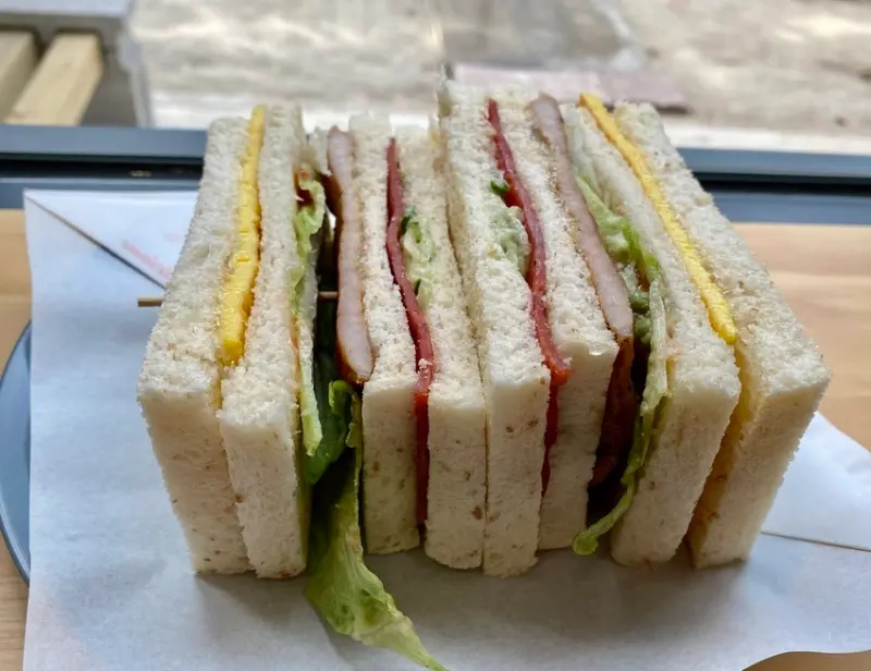 總匯三明治的肉排似乎不是組合肉,有相當的厚度也讓人驚訝,通常傳統早餐店的總匯三明治都是用組合肉,也不會太厚啊。<全文介紹>