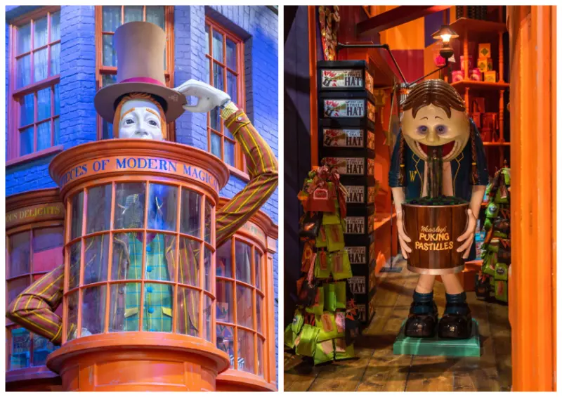 對《哈利波特》鐵粉來說,小說第一集就出現的「斜角巷」是經典到不行的場景,這裡有銀行、書店、魔法道具店、服飾店等店舖,對霍格華茲新生而言,只要來一趟就能準備好學校需要用到的物品。除了斜角巷以外,對書迷來說「活米村」也是令人印象深刻的場景,而官方在開園之前也搶先透露,在拍攝過程中,其實活米村就是將原有的斜角巷佈置成白雪皚皚的樣子,而且斜角巷的所有場景不時會巧妙地被改變牆壁位置或建築物角度,變成電影所需的景觀,可說是相當有效地被利用。