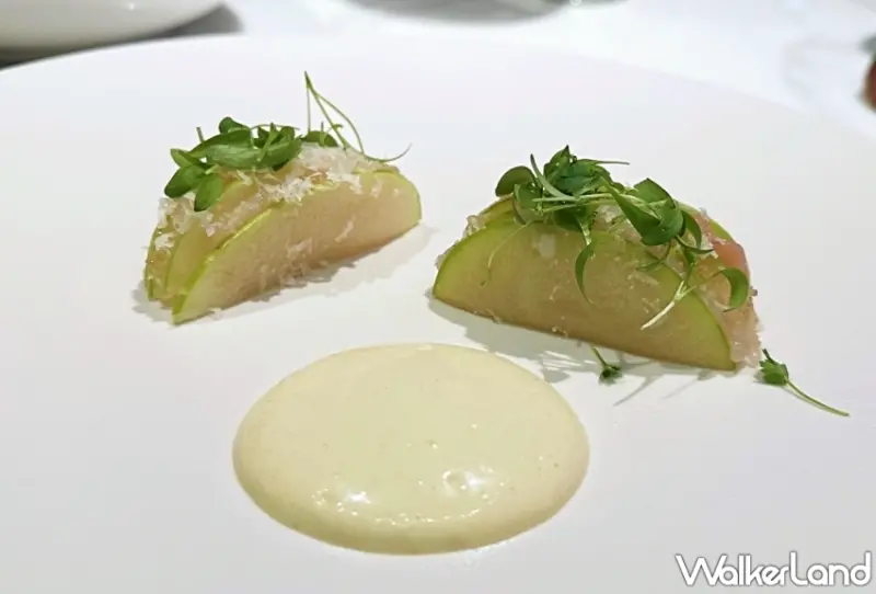 而在五道1,880元起的優惠組合之中,主推經典的「北海道馬糞海膽燉蛋」濃郁滑順的燉蛋充滿鮮美海味;另特別推薦「青甘魚 青蘋果 阿里山山葵」,以昆布醃漬的青魽肉質鮮甜、柔嫩,與青蘋果薄片層疊交錯,搭配上糖煮蘋果丁與阿里山山葵美乃滋的甜味、辛香和發酵酸度,風味清新開胃。