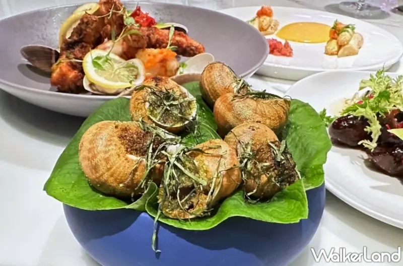 還有法餐必吃「勃根地蝸牛」,勃根地蝸牛為法國勃根地原生品種,肉質飽滿而深受喜愛。主廚將進口鍋牛,以傳統作法的香草、大蒜奶油炒製,並將鍋牛肉回放於鍋牛殼裡,於殼口撒上香草麵包屑、九層塔為滑嫩蝸牛帶來不一樣的香脆口感。