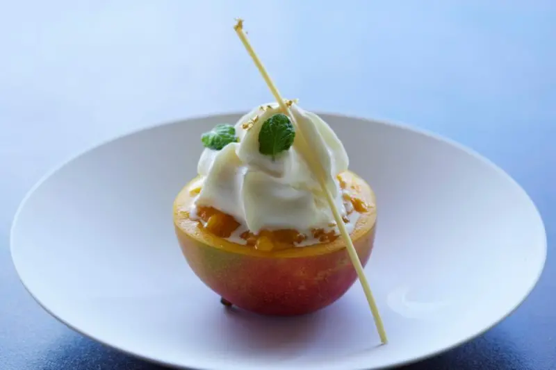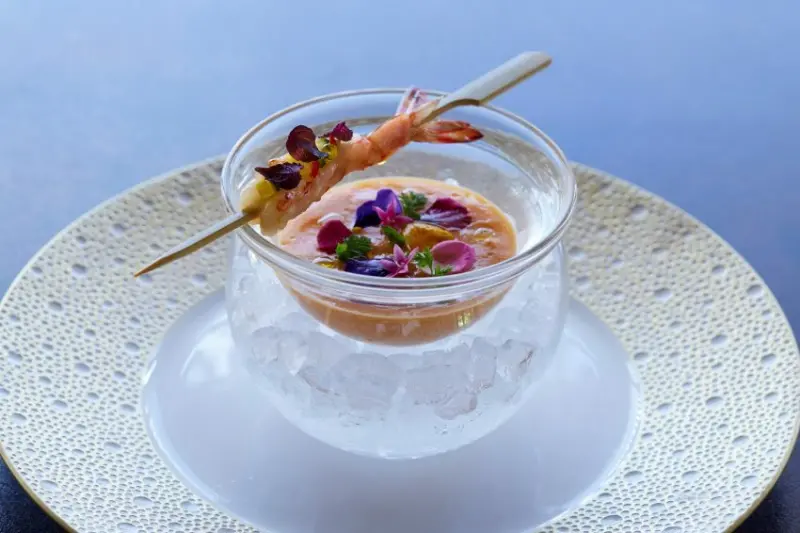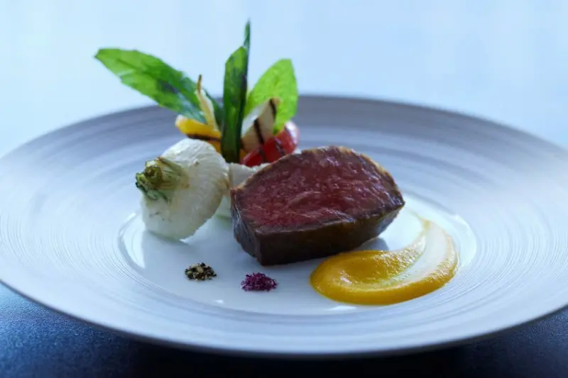 當島上遇到喜事或祭祀儀式時,會有吃山羊的文化,因此旅客也可於前菜品嚐到韃靼山羊肉,體驗在地島民的美食。主菜將提供煙燻牛肉配苦瓜或是島蕗蕎等蔬菜,餐後酒則是提供水果利口酒,完美將島上風格食材融入法式料理,如此極致的高品質晚宴,一生擁有一次也不為過。