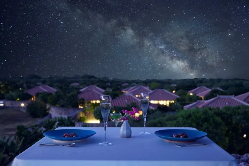 堪稱此地最高檔的旅宿酒店「虹夕諾雅 竹富島」,從客房、庭園到植栽等,都是沿襲竹富島原有景觀進行設計,沒有會遮住風景的電線桿,可說是坐擁觀賞星空的絕佳地理位置,因此預計於今年6月5日至8月26日期間舉行在萬點繁星下享用美食的「群星晚宴」,為的就是希望能讓所有入住房客體驗到前所未有的壯麗星空景觀。