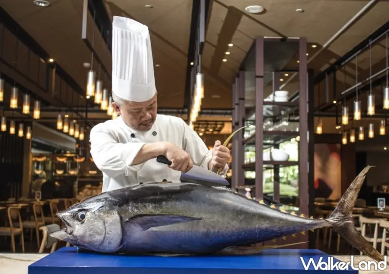 同時,主廚團隊特別於活動期間每週五晚上準備了精采絕倫的鮪魚秀,將重達25公斤、全長約80公分的鮪魚現場解體,表演刀起刀落的專業片魚,並準備主廚特製液態氮鮪魚韃靼限定佳餚,炙燒過的鮪魚加上清甜蘿蔔絲,將和風柚子冰沙以液態氮急速冷凍後放在鮪魚上,鮮美魚肉與沁涼綿密的冰沙呈現絕妙口感,氮氣煙霧也帶來驚奇有趣的視覺效果,此道主廚特製佳餚於週末假日午餐與晚餐也會加碼供應。