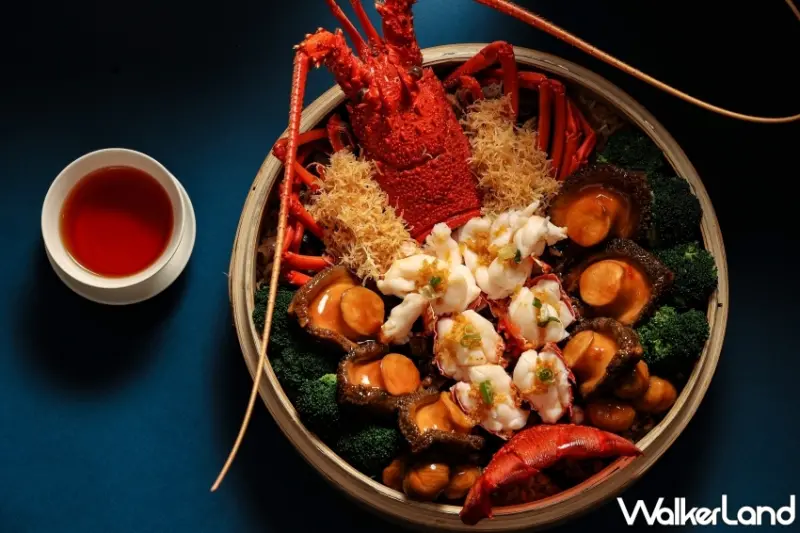 接下來則豪邁的鋪上一整隻蒜蓉清蒸澳洲龍蝦,以及由雞骨上湯蠔油調味慢滷而成的醬香南非鮑魚,旁邊擺滿口感綿密細緻的栗子、鮑汁燜煮入味的台灣花菇切成丁狀拌入油飯中以增添豐富口感、搭配鹹香開胃的廣式肝腸、臘腸,最後撒上酥炸黃金瑤柱絲,以及青蔬增添綠意,用料澎派、份量十足。