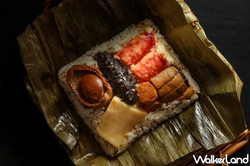 爽嫩脆口的刺參則耗時5天反覆泡、發、洗,再以高湯、蠔油扣燉入味。連包粽用的長糯米與圓糯米,也是浸泡一晚後蒸熟,再加入紅藜麥增添口感與香氣,佐以油潤鹹蛋黃、栗子、蓮子、及冬菇,再以香氣特殊的竹葉與荷葉雙層包裹後蒸3小時而成。食用時佐以主廚自製蠔油,豐富食材與綿密糯米完美交融,展現了視覺與味覺兼具的美食體驗,每顆600克、可供四人享用,價格為8,800元。