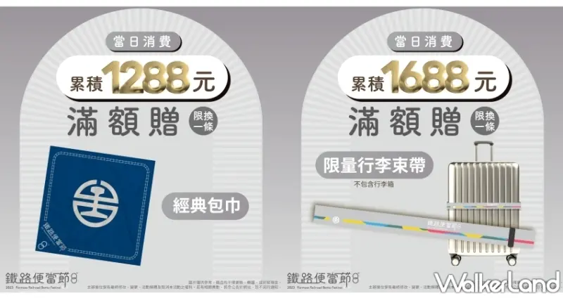 最後,只要於活動期間在展區消費,即可獲得限量臺鐵特色的滿額禮,滿1288元可兌換復古便當包巾、滿1688元可兌換最美自強號「EMU3000型特仕車」造型旅遊行李束帶,只送不賣,絕對不能錯過。