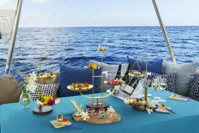 為了因應暑假旅遊潮,「虹夕諾雅 沖繩」將於今年6月1日至9月30日期間,推出「海風航遊」方案,旅客可從機場附近的港口搭上私人遊艇,前往臨靠海岸線的飯店。平穩低晃動的遊艇上,有船內貴賓室及船外客廳區等多個休憩空間,在這趟約2小時的船旅之中,還可在船上的貴賓酒廊,品嚐香檳、水果以及西班牙式小點「Pinchos」 等美食,盡情沉浸於碧波盪漾的美景中。