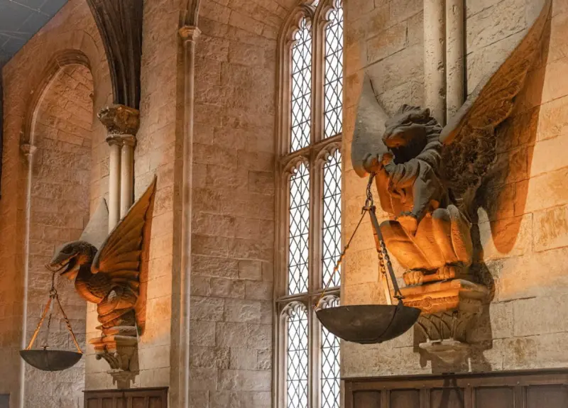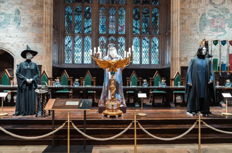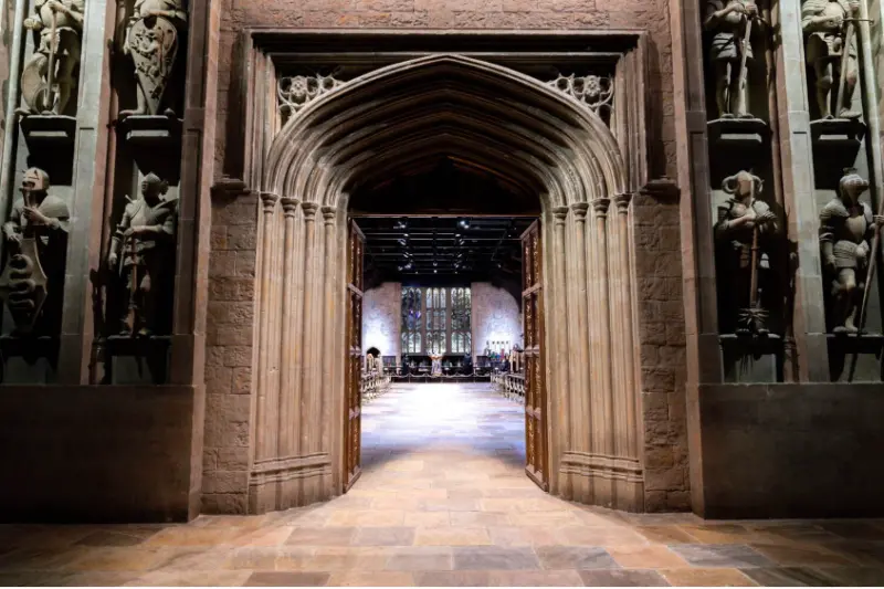 在進入霍格華茲餐廳之前,首先映入眼簾的就是電影當中那令人熟悉的金色雄偉大門,門上除了裝飾著各式美麗古典的裝飾,門口兩側的牆壁上列隊擺放了相當多具鎧甲騎士的雕像,光是看到這些,就令人心情超澎湃,等不及開啟魔法之旅!打開大門後,就是我們熟悉的霍格華茲餐廳了,擔任《哈利波特》背景美術指導的史都華.克雷格以前就曾透露過,這座餐廳的鵝卵石地板與木棧板牆,設計靈感其實都來自於英國牛津大學基督堂學院的餐廳,所以也有很多鐵粉到英國遊玩時,都會特別至牛津大學朝聖。