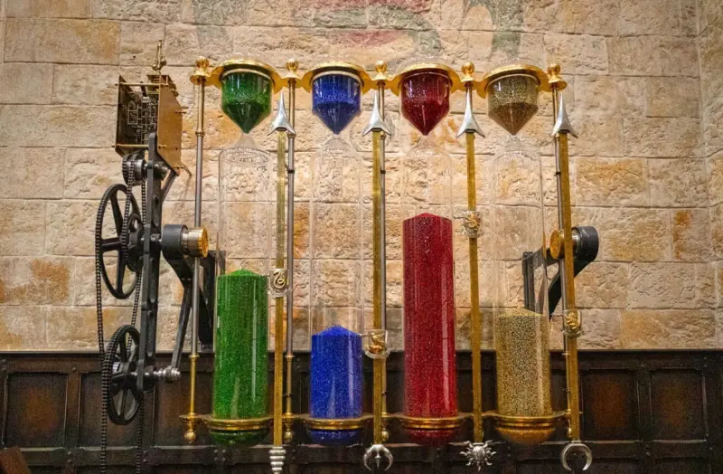 另外值得一提的是,象徵各個宿舍的動物造型燭台,其實都一一排列在霍格華茲餐廳的磚牆上,還有計算宿舍積分的巨型沙漏也出現在此,雖然很少出現在電影當中,但這些其實都是電影道具組引相當以為豪的作品之一。