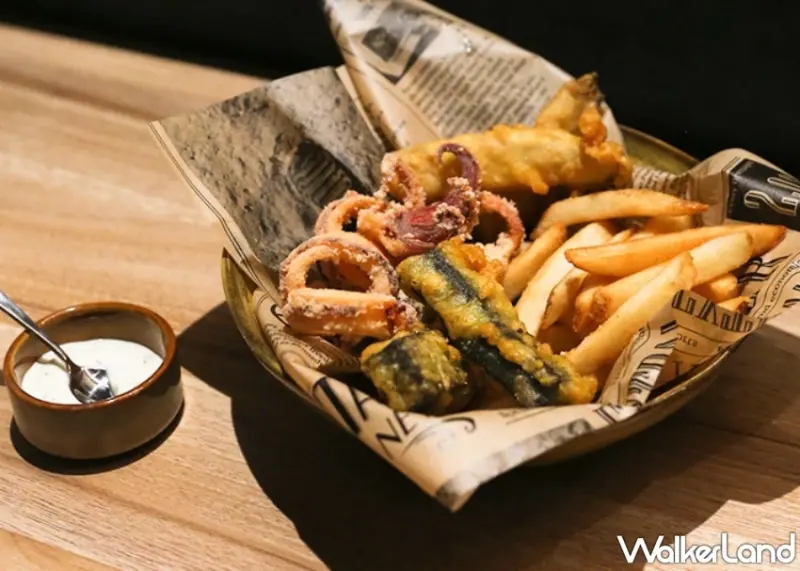 同時,Blue Fish Bar還有「酥炸海鮮拼盤」,食材選用安永集團的明星產品:安永金目鱸魚條、安永黑鑽松露蘿蔔糕條、安永船凍透抽等,以單純的海鹽與黑胡椒調味,搭配自製塔塔醬一起享用。酥脆麵衣吃得到食材口感,搭配清爽的塔塔醬,經典口味老少咸宜