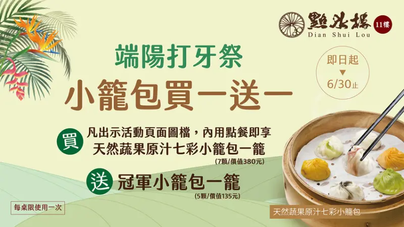 堪稱是台灣江浙料理的領頭羊「點水樓」,不論是人氣烤鴨、還是點水烤方、又或都季節限定料理,每一道都讓老饕們讚不絕口,這一次點水樓為了吸引老饕們的目光,特別與SOGO復興館合作,推出粉絲團限定活動,只要出示粉絲團圖示,就可享有點七彩小籠包送冠軍小籠包、買一送一優惠活動,每桌限一組。