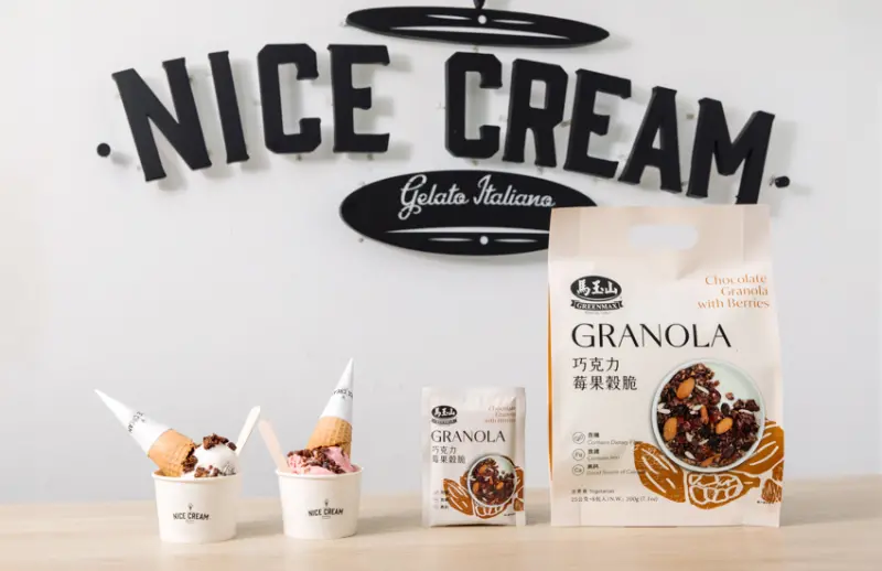 NICE CREAM每一款冰淇淋皆符合純素可食、清爽健康,減碳環保的世界潮流,加上馬玉山的巧克力莓果穀脆(全素食)後,義式冰淇淋清爽柔滑的冰涼口感與巧克力穀脆香酥、莓果香甜交織,變得更加豐富有趣,讓人吃完還有再吃好幾球的衝動,讓人在夏日幸福無比幸福!