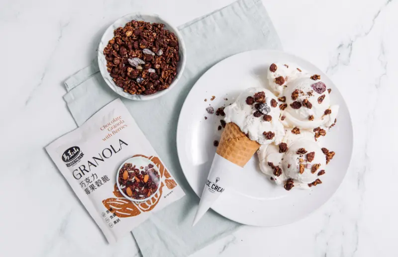 馬玉山GRANOLA輕烤穀脆採隨身的小包裝設計,包包沖氮保鮮,即開即食,每次吃都會是最新鮮酥脆的狀態,加在巴西莓碗、100%天然純素的義式冰淇淋上,瞬間堆疊出美味層次,營養也更均衡,幸福甜蜜的療癒食感瞬間翻倍!