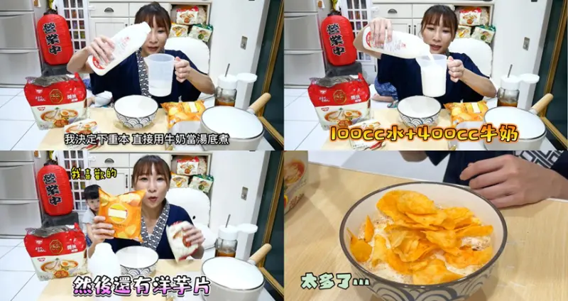 一開始從TOP 8中轉出第一輪的創意搭配吃法牛奶搭洋芋片,Abby決定下重本直接把牛奶當湯底,但怕煮焦所以加了400cc牛奶+100cc的水來煮出完美比例,煮滾後慢慢倒入湯粉和調味油,最後放入麵體和洋芋片就完成了!Abby品嚐發現牛奶湯底和湯粉混合後味道更加濃郁,搭上酥脆的洋芋片,鹹甜鹹甜的口感超級讚!