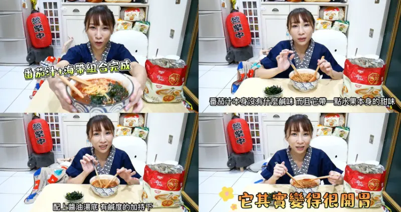 第二輪的創意搭配吃法番茄汁搭上海帶芽,Abby帶著實驗精神直接把340cc的番茄汁+160cc的水一起混和倒入和麵體烹煮,煮滾後慢慢倒入湯粉和調味油,最後放入麵體和海帶芽!