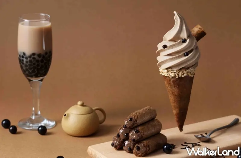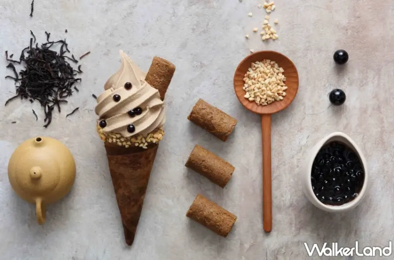 這一次快閃青鳥旅行獨家販售的「珍珠奶茶蛋捲霜淇淋」,嚴選錫蘭紅茶搭配北海道十勝頂級生乳,交織出帶有細緻茶香的霜淇淋,點綴以日本沖繩黑糖蜜漬的現煮珍珠,Q彈有嚼勁,醇厚奶茶香中透出微微黑糖甘味、甜而不膩。
