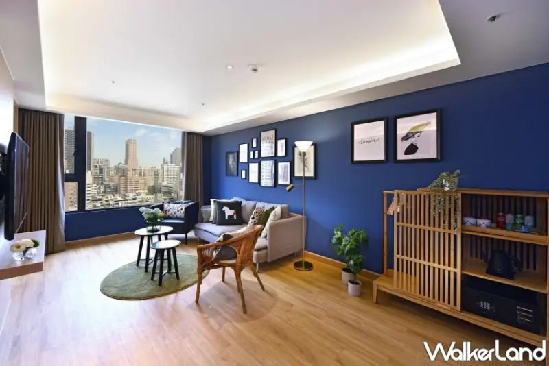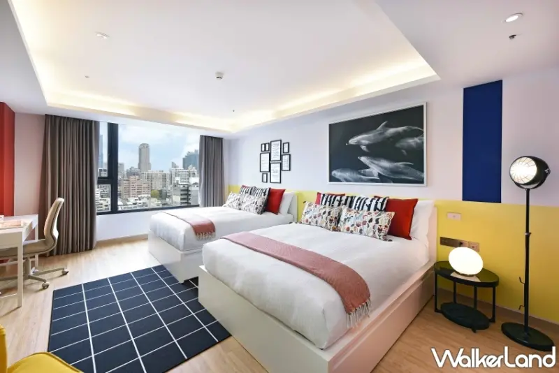 位在15樓由IKEA設計的主題樓層,一出電梯,就可以看到以鵝黃色為底牆的梯廳,充分展現北歐風格的活潑感。牆上以木條箱當櫃子,擺飾著綠色植栽,還有一隻穿著飯店制服的鯊魚玩偶,饒富趣味,更是十足的網紅打卡牆。![]()