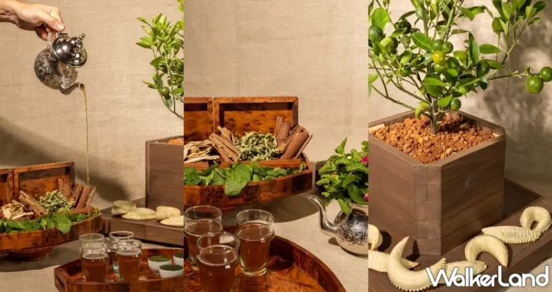同時,皇家茶起源於18世紀,當時只有皇室貴族才有資格飲用,如今則成為了摩洛哥國民飲品。對於當地人來說,薄荷茶也象徵著滿腔的愛意以及「好事發生」。透過玫瑰、人參、薑片等乾燥香料與滿滿新鮮薄荷一起放入銀壺泡開,三次反覆沖泡並於盛倒之時拉高茶壺,讓每一滴落的薄荷茶精準倒入透明玻璃杯。淡淡茶香,清涼尾韻在喉中無限回甘。
