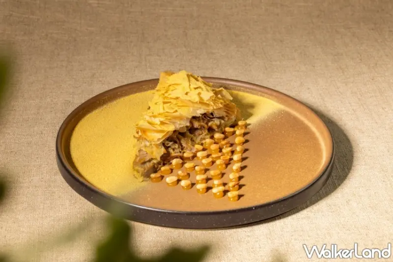 還有吃一口就會喜歡的「櫻桃油封鴨腿 - 朝鮮薊 - 巴斯提拉 」摩洛哥傳統料理- 巴斯提拉多使用鴿子肉,廚藝總監James將摩洛哥柑橘調性與台灣在地食材融入此道料理。薄脆酥皮 包覆肉質豐潤、油質豐富的橙醃櫻桃鴨腿,鋪上以牛油和百里香煎烤至金黃的朝鮮薊、撒上杏仁碎片增添香氣口感。盤上工整點綴柑橘果醬及柑橘糖粉,猶如摩洛哥磚瓦上的幾何圖形,視覺到舌尖的細膩呈現,一場感官盛宴口中盛開。