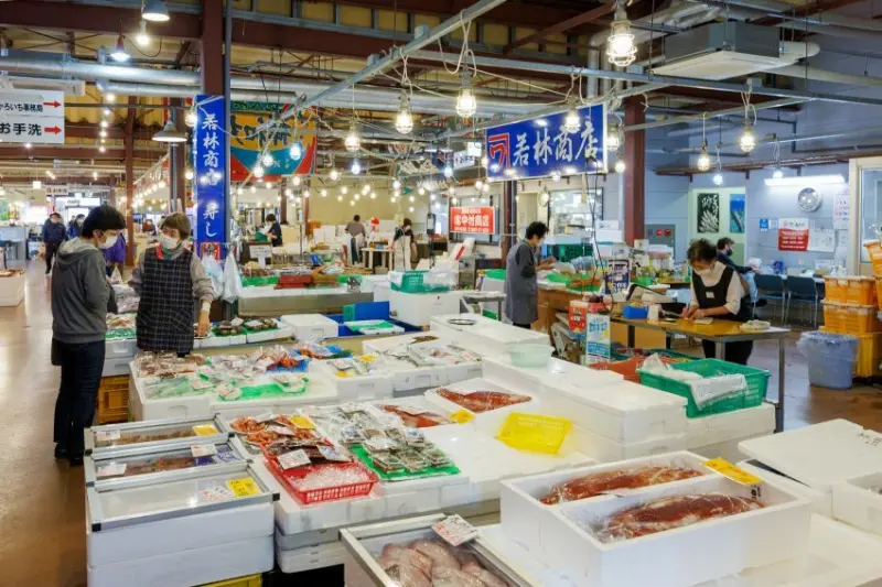 賀露海鮮市場被譽為「鳥取市的廚房」,離鳥取賀露港路城只有2分鐘,聚集許多剛捕撈的新鮮海產,也是知名的農產物的直賣所和伴手禮購買處。在附近的餐廳裡能夠品嚐到各式魚貝類、岩牡蠣、松葉蟹等等料理。![]()