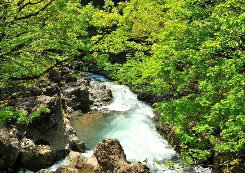 「真瀬溪谷」是白神山系源流的真瀨川打造成的美麗溪谷,位於秋田縣海側的最北端「八峰町」,一邊走在步道上、一邊享受沉浸在大自然的芬多精當中,是很受歡迎的景點,還有流敞在鍋狀甌穴之間的美麗清流「三十釜」等無數個看點。