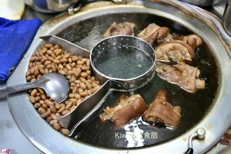 老闆娘不斷地從湯裡取出超大的豬腳,在湯頭裡燉煮好幾個小時的豬腳已經沾附著淡淡的中藥香,拿起鐵盤就要直接切下豬腳,淋上湯,簡單味美就上桌了。<全文介紹>