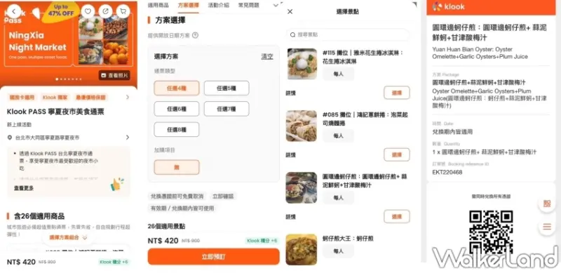 全新Klook寧夏夜市美食通票,包含夜市老字號和經典必吃近30間攤商與店面,消費者可以在Klook頁面上先預訂,選好是要4間、5間甚至8間任選的方案後下訂,預訂完畢後到訂單頁面中挑選想要吃的美食,蚵仔煎、炙燒骰子牛、地瓜球、炸雞、珍珠鮮奶茶、芒果雪花冰各種夜市經典美食應有盡有。