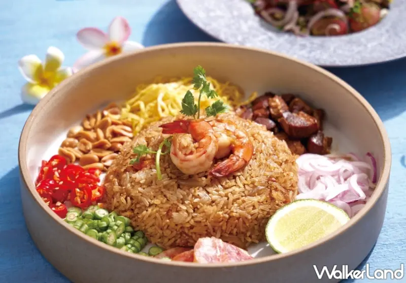 最後,就是泰國中部常見菜「蝦醬炒飯Khao Kluk Kapi」用當地傳統鮮蝦醬加入泰國香米爆炒,搭配8種配料包含滷肉、臘腸、豇豆、蛋絲、炸花生、辣椒、紅洋蔥等,趁熱拌在一起享用,豐富食感鹹香夠味,每一口都很泰味、每一口都很好吃。