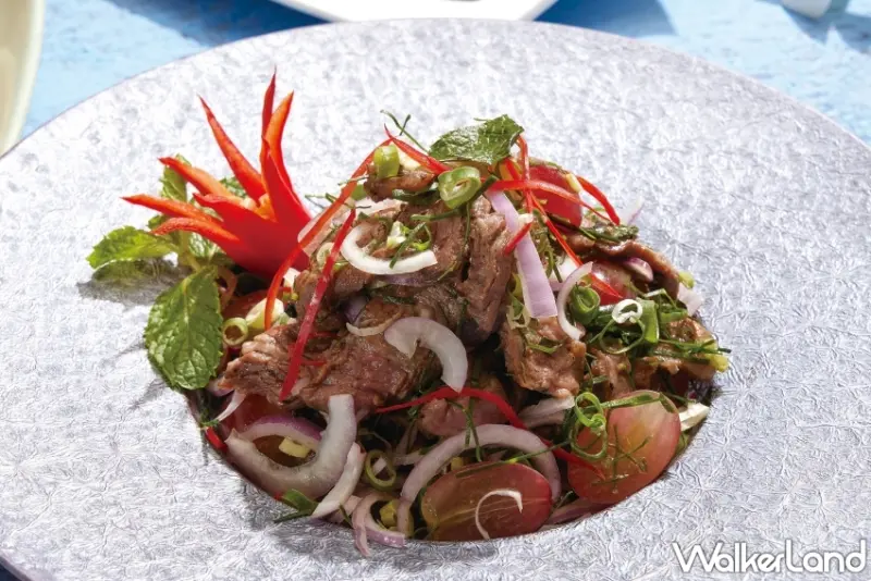 此外,鮮爽開胃的「涼拌牡蠣」是當地餐廳常見菜色Yam Hoi Nang Rom,選用肥嫩的廣島牡蠣,以特製泰式辣椒膏拌入開陽、香茅、薄荷葉與檸檬葉等,鮮甜牡蠣在嘴裡爆漿,伴隨陣陣辣味一吃上癮。同時,「火烤牛肉葡萄沙拉」泰國當地餐廳招牌菜色,沙朗牛肉以泰式香料醃製後炭火燒烤,搭配新鮮葡萄、香茅與薄荷,多汁果肉與炭香牛肉完美結合,夏日清爽又開胃。
