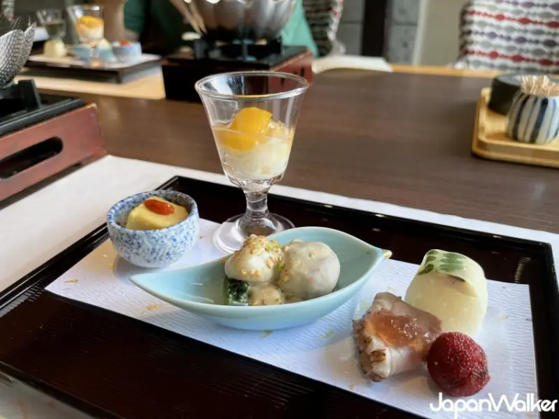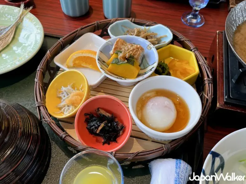 而早餐的部分則是提供個人式的套餐,相當澎湃的份量一上桌,就連成年男性吃了都會覺得飽到天靈蓋!除了廚師運用精細的烹飪技巧,完成由豐富的季節食材所組成的一碟碟小菜,還有整整一條竹筴魚和豆腐味噌鍋,讓旅客在早上就補充滿滿元氣與體力,足以應付接下來一整天的玩樂行程。