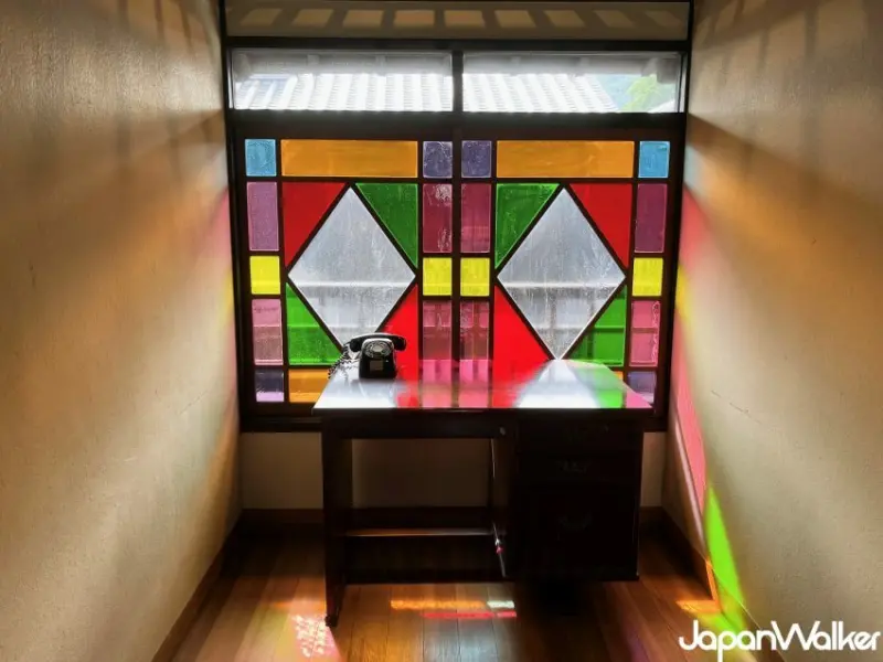 值得注意的是,「御舟宿伊呂波」有名不只是因為坂本龍馬曾在此談判,另一個很重要的原因是數年前正逢整修時,動畫大師宮崎駿知道此處與坂本龍馬淵源深厚,因此曾主動表示自己也想為部分裝潢提供設計,像是二樓公共盥洗台的馬賽克玻璃窗就是出自宮崎駿的創意。