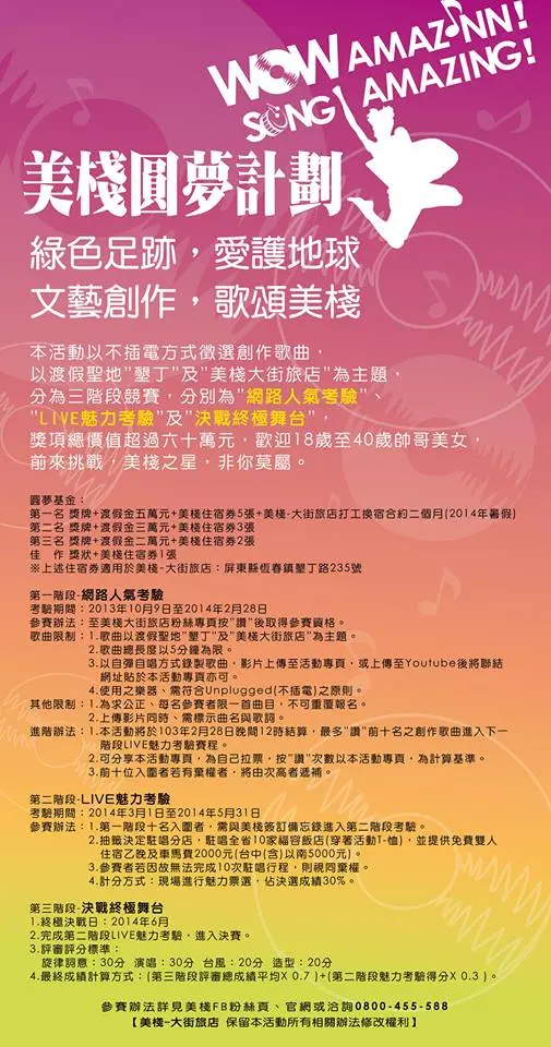 開幕另一重頭戲-啟動「美棧圓夢計畫」徵選活動,鼓勵素人或年輕學子發揮想像力勇敢創作,不插電方式,以墾丁及美棧為主題,徵選單曲。第一階段網路人氣票選前十名,進入第二階段魅力考驗,安排全省福容大飯店巡迴演唱,第三階段夢想舞台,最後決賽前三名,依序可獲得金額不等的渡假金及住宿券;第一名優勝者還可得到美棧大街旅店兩個月打工換宿合約,於明年暑假駐店表演;參賽辦法,請密切留意美棧臉書粉絲團及官方網站。本活動獎項總額價值超過新台幣六十萬元,歡迎大家來挑戰。