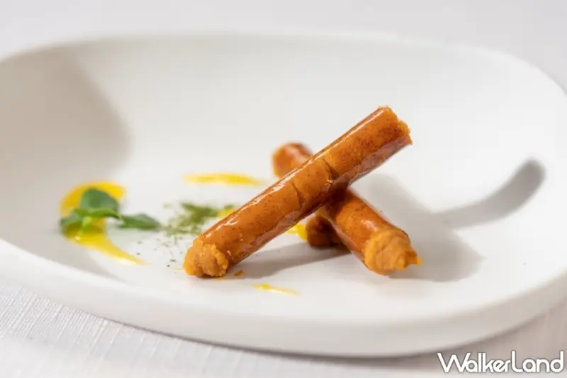 還有,「焦糖臘腸捲 vs 大摩雪莉12年」西班牙本店最經典的招牌料理。以極薄的糖片與西班牙煙燻紅椒粉製作的糖衣在入口瞬間釋放熱烈的辛香氣息,再以綿滑的巴斯克風味臘腸Txistorra慕斯作為內餡,與一旁的蛋黃醬與巴西里粉做搭配。再搭飲著大摩雪莉12年,醇厚的堅果甜香、層層交疊的水果與香料香氣。