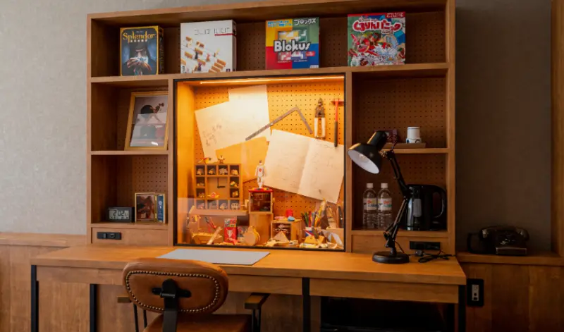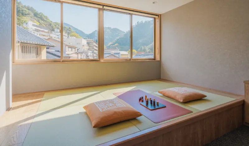 每間客房都以博物館的玩具工作室為主題,設計師在室內的書桌上擺放了設計圖、作品和實際使用的工具等,讓入住房客可以一窺玩具製作的幕後場景。此外,客房內還設有榻榻米區域作為玩樂空間。從室內可以欣賞到溫泉街的主要道路,讓房客充分享受溫泉旅館的情調。![]()